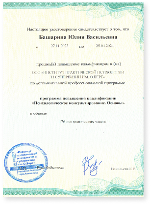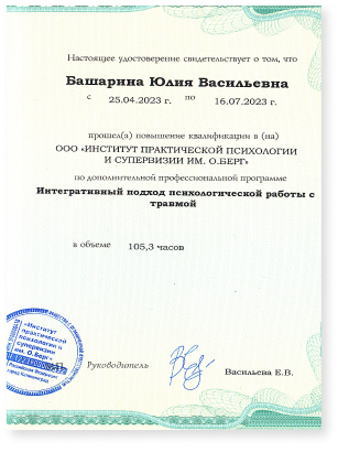 Меня зовут Юлия Башарина, я — дипломированный психолог со стажем более 10 лет. Работаю в интегративном подходе и не являюсь сторонником одного терапевтического подхода в своей работе. Работаю в двух направлениях: краткосрочная — акцент делается на работе с конкретным запросом. В результате, мы вместе с вами дойдём из точки А в точку Б, то есть к той цели, которую вы перед собой поставили. Долгосрочная — это путь к глубокому пониманию себя, своих эмоций. Она помогает не только разобраться в своих проблемах, но и найти способы их решения. А также развить новые навыки и стратегии для более здоровых способов общения.